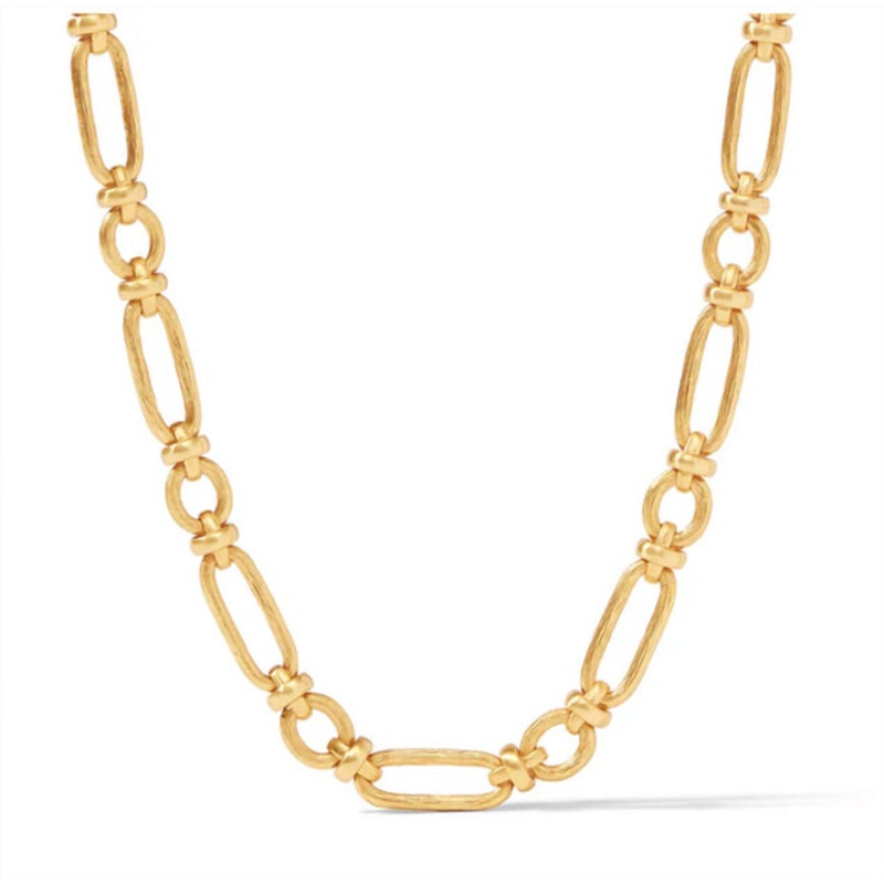 20.5 inch length. 24K gold plate. The golden links of this necklace are delicately hand-etched and contrast with the polished cross links connecting them.