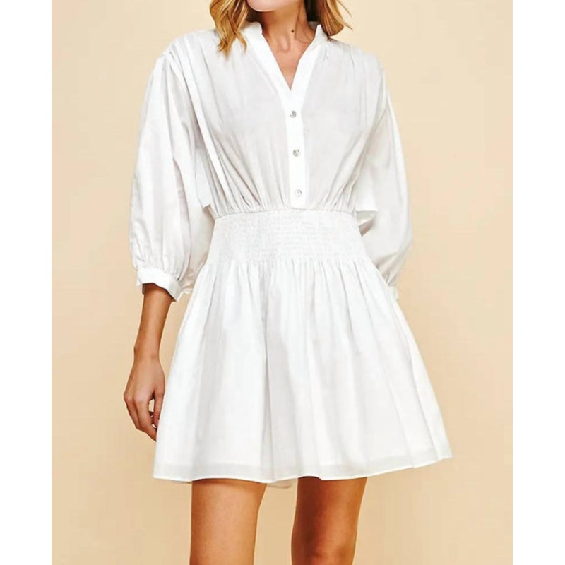 The perfect mini dress for those warmer months.Button down mini dress. Mandarin collar. Smocked waistband. 3/4 sleeves. Model wears a size small. Fabric - 100% cotton.